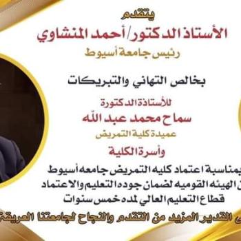 تتقدم السيد الاستاذ الدكتور سماح محمد عبدالله عميد الكلية باجمل التهانى القلبية للسيد الاستاذ الدكتور احمد المنشاوي رئيس الجامعة ولأسرة جامعة أسيوط عامة وأسرة كلية التمريض من أعضاء هيئة التدريس والعاملين والطلاب بالكلية لصدور قرار اعتماد الكلية