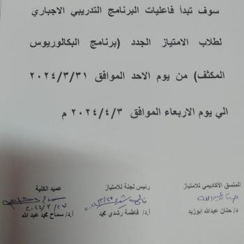 إعلان تبدا فاعليات البرنامج التدريبي الاجباري لطلاب الامتياز الجدد يوم الاحد 31/3/2024م.