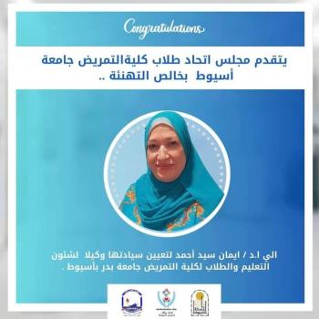 تتقدم السيد الاستاذ الدكتور سماح محمد عبدالله عميد الكلية والسادة الوكلاء والسادة رؤساء الأقسام والسادة اعضاء هيئة التدريس والعاملين والطلاب بالكلية باجمل التهانى القلبية للسيد الاستاذ الدكتور ايمان سيد احمد لتعينها وكيلا لكلية التمريض جامعة بدر