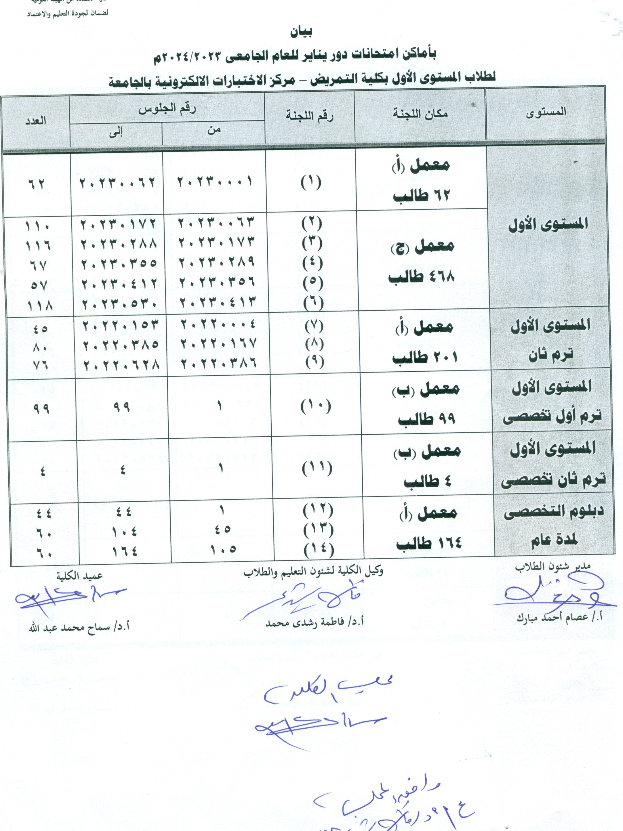 بيان بأماكن أمتحانات دور يناير للعام الجامعي 2023/2024م  لطلاب المستوي الأول بكلية التمريض - مركز الاختبارات الألكترونية بالجامعة