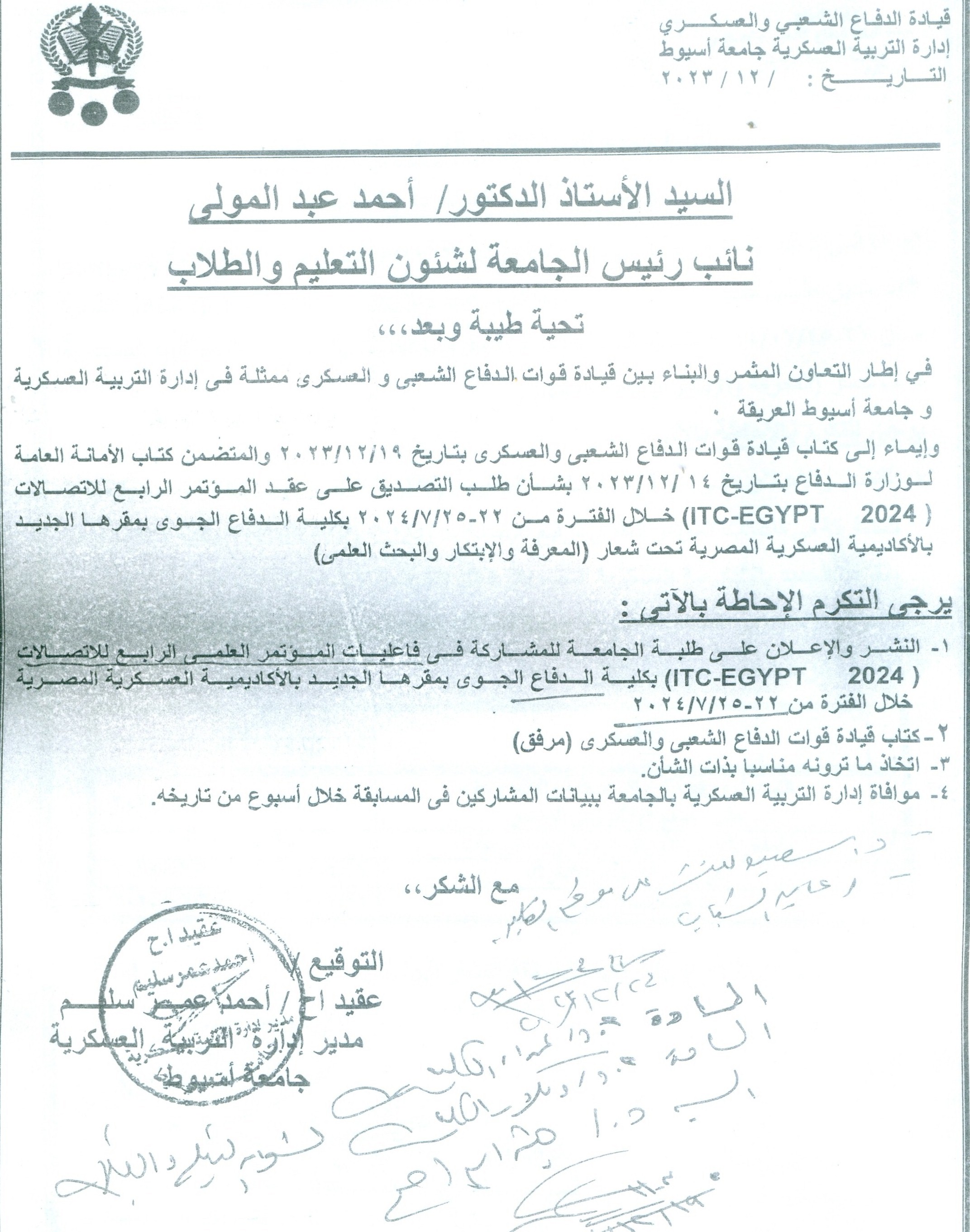 إعلان لطلبة الجامعة للمشاركة في فاعليات المؤتمر العلمي الرابع للاتصالات (ITC-EGYPT2024) خلال الفترة من22-25-7-2024 بكلية الدفاع الجوي بمقرها الجديد