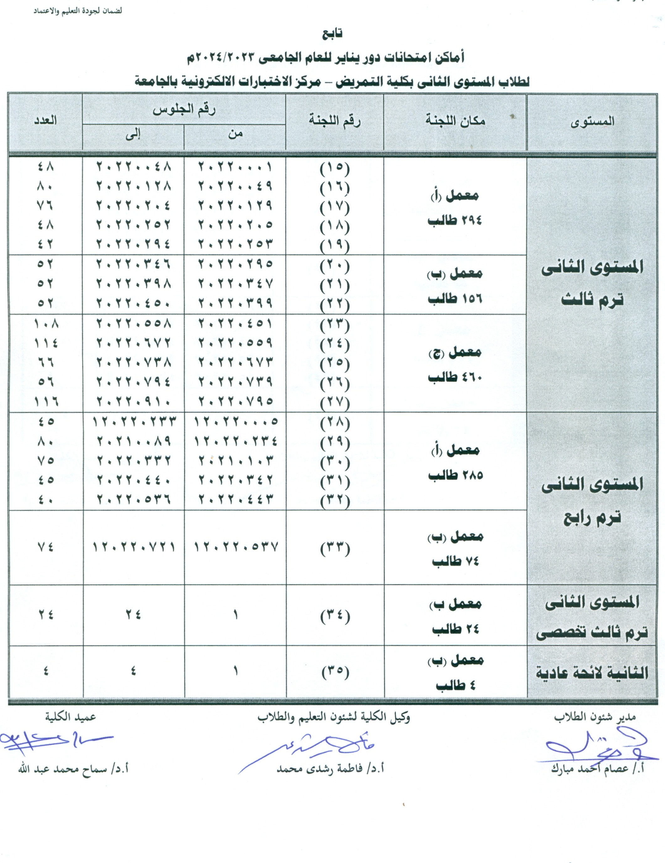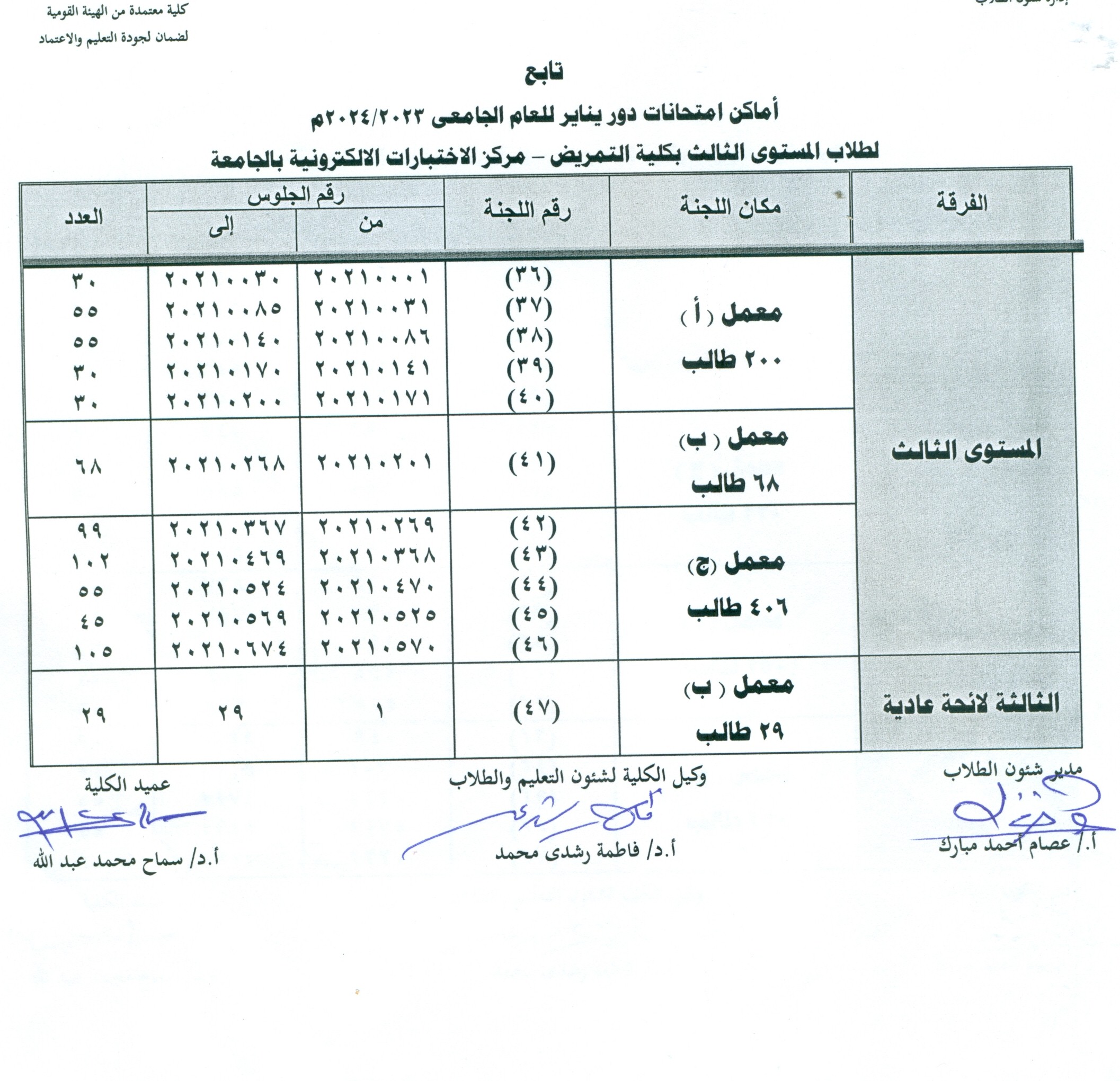بيان بأماكن أمتحانات دور يناير للعام الجامعي 2023/2024م  لطلاب المستوي الثالث بكلية التمريض - مركز الاختبارات الألكترونية بالجامعة