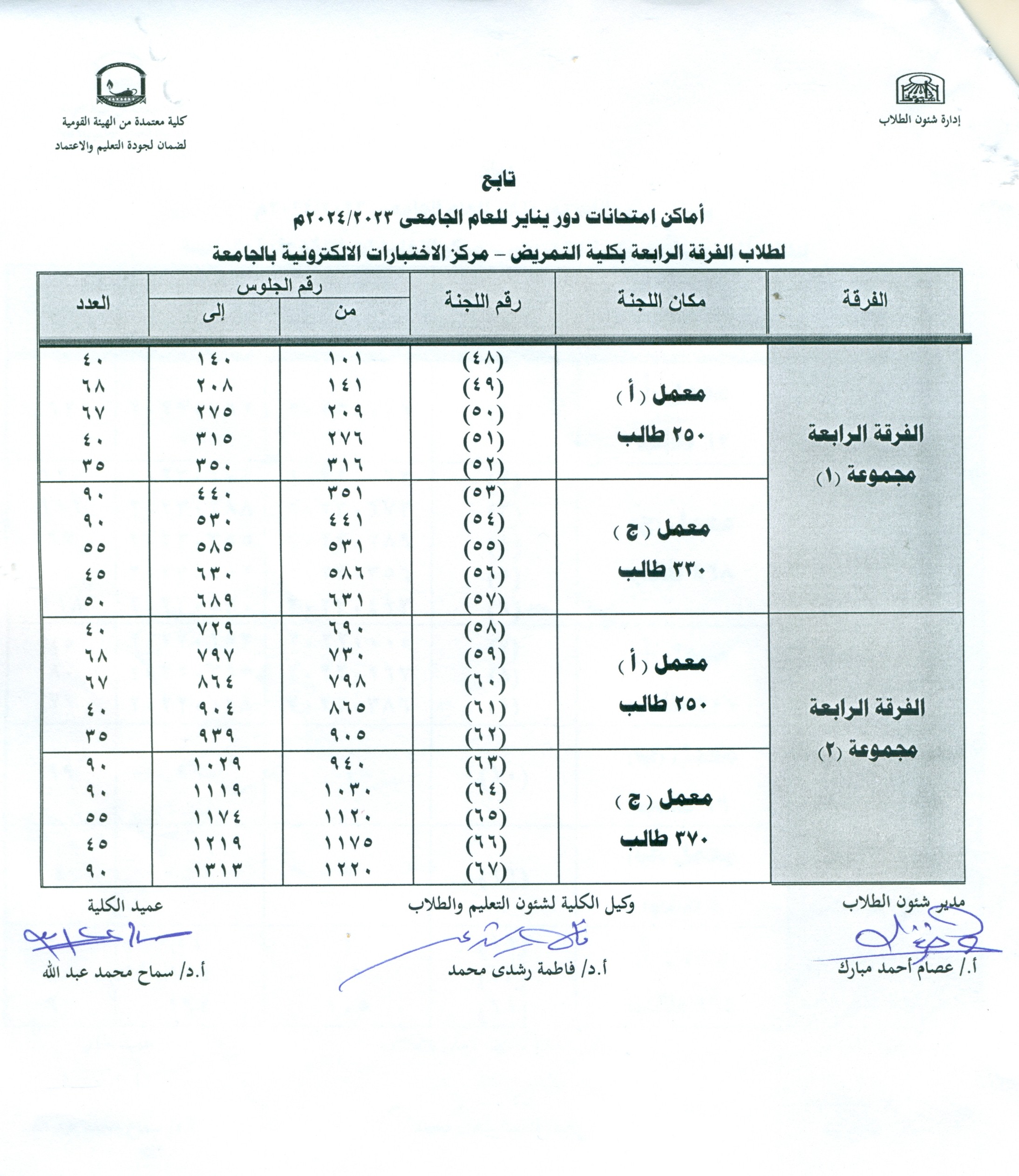 بيان بأماكن أمتحانات دور يناير للعام الجامعي 2023/2024م  لطلاب الفرقة الرابعة بكلية التمريض - مركز الاختبارات الألكترونية بالجامعة