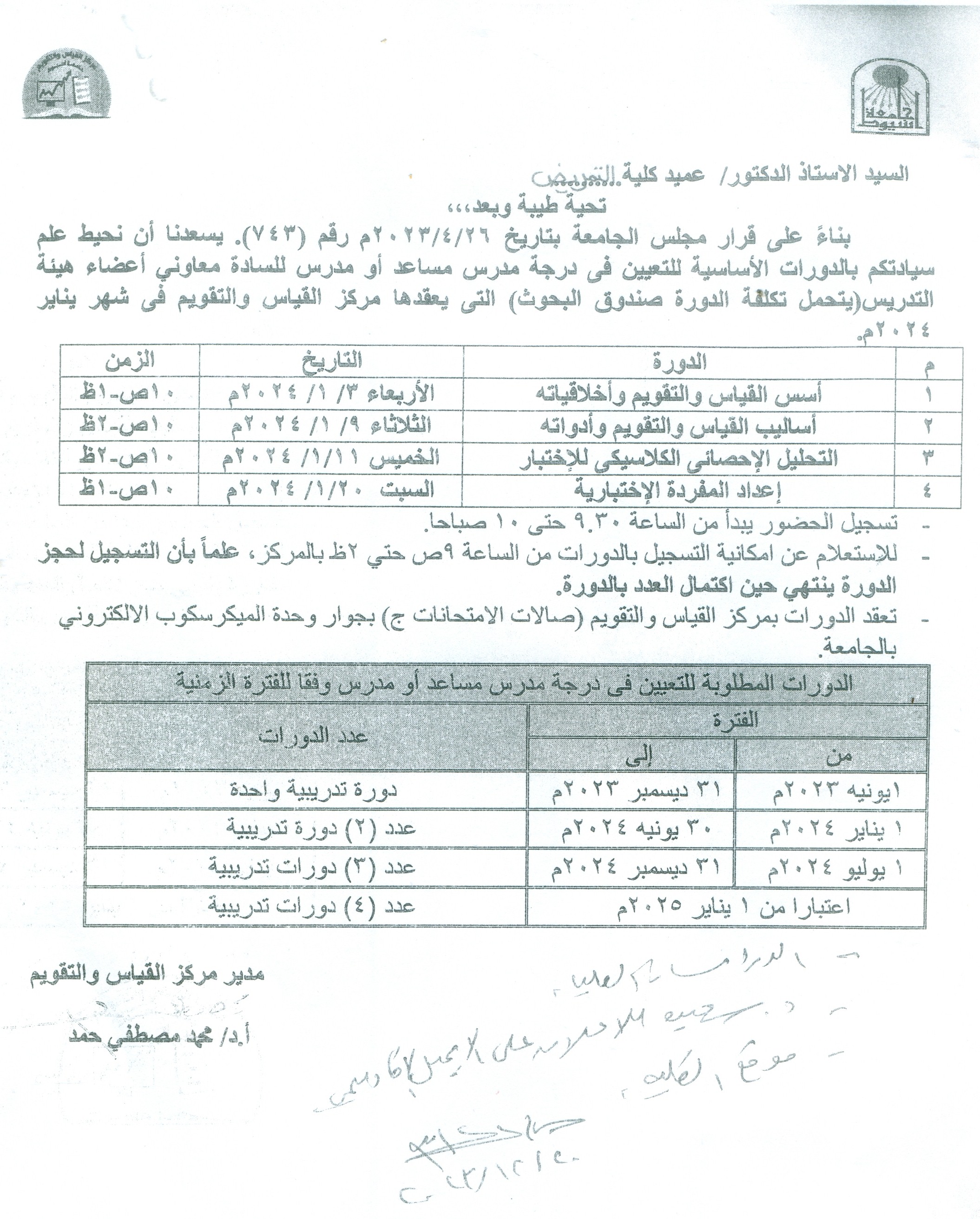 الدورات الاساسية للتعيين في درجة  مدرس مساعد أو مدرس للسادة معاوني أعضاء هيئة التدريس التي يعقدها مركز القياس والتقويم في شهر يناير 2024م