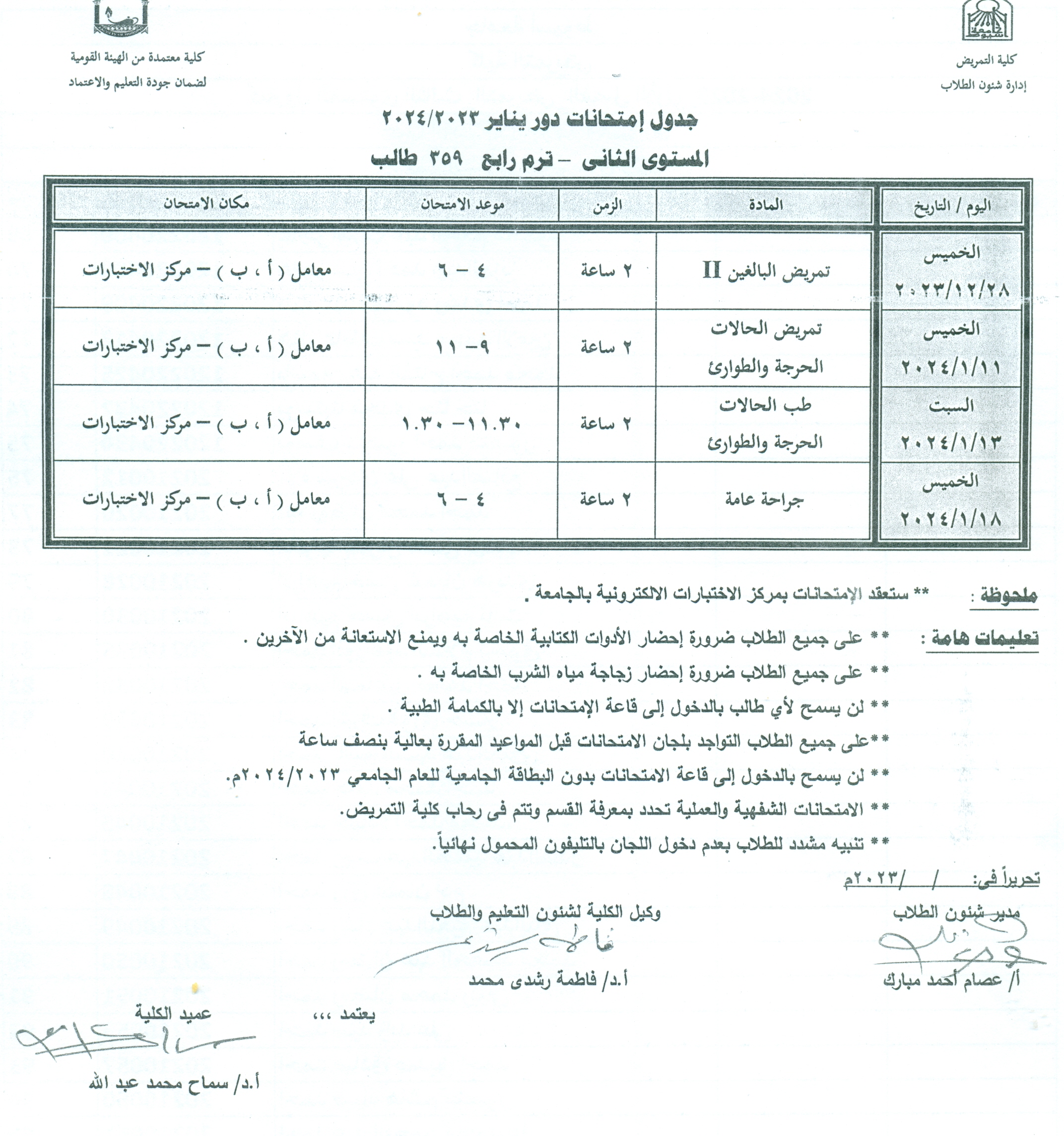 جدول امتحانات دور يناير 2023/2024 المستوي الثاني – ترم رابع 359 طالب