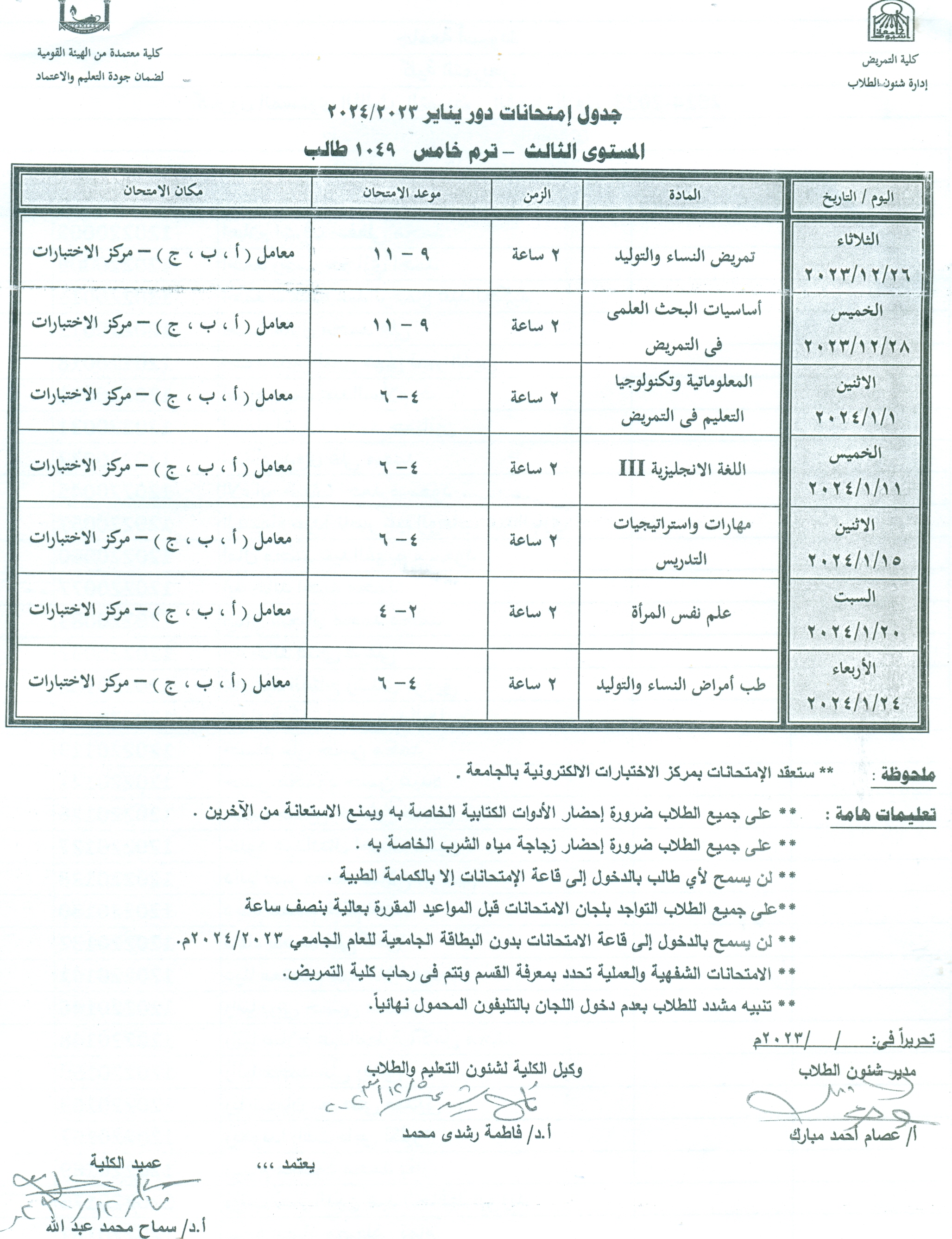 جدول امتحانات دور يناير 2023/2024 المستوي الثالث – ترم خامس 1049 طالب