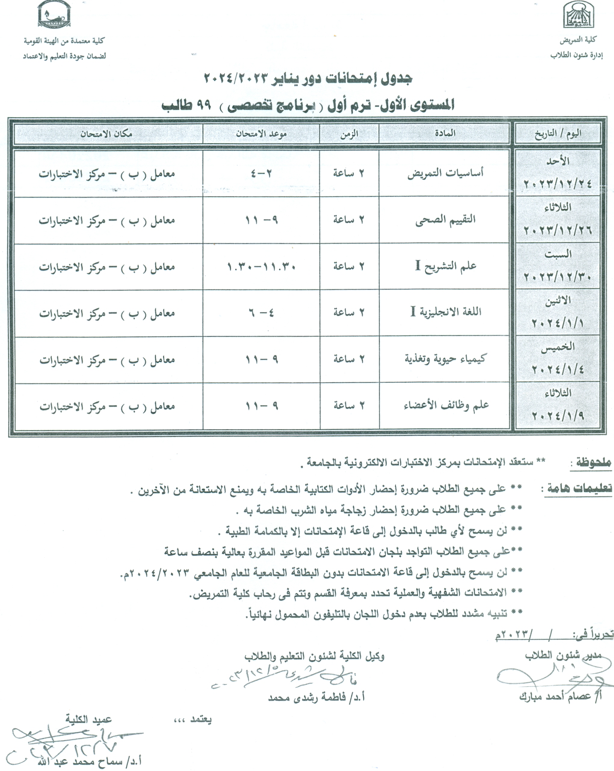 جدول امتحانات دور يناير 2023/2024 المستوي الأول – ترم أول –( برنامج تخصصي) 99 طالب