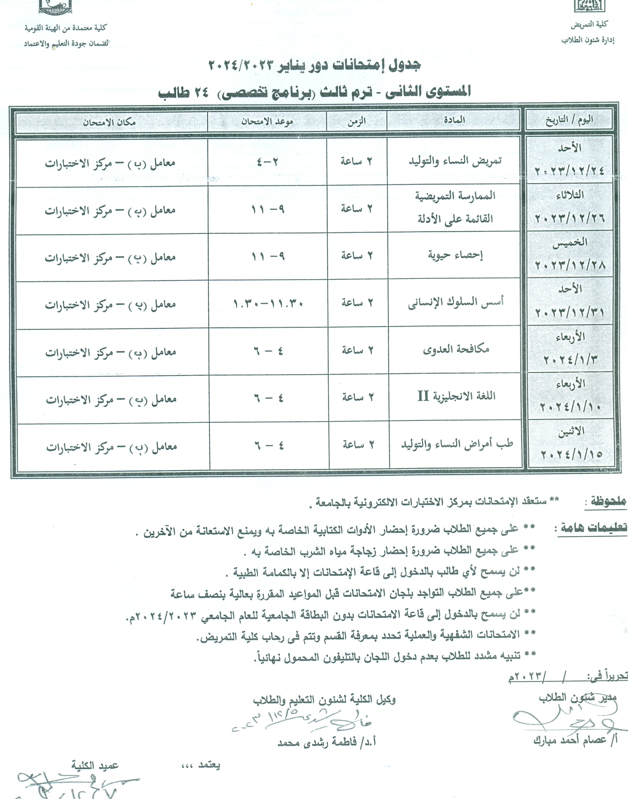 جدول امتحانات دور يناير 2023/2024 المستوي الثاني – ترم ثالث –( برنامج تخصصي) 24 طالب