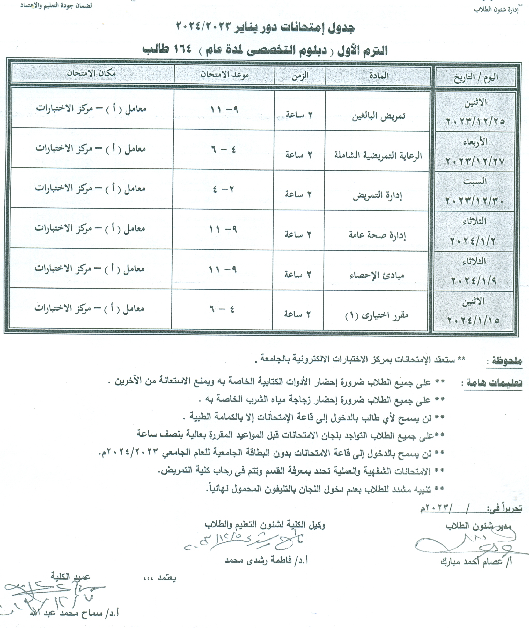 جدول امتحانات دور يناير 2023/2024 الترم الأول ( دبلوم التخصصي لمدة عام ) 164 طالب