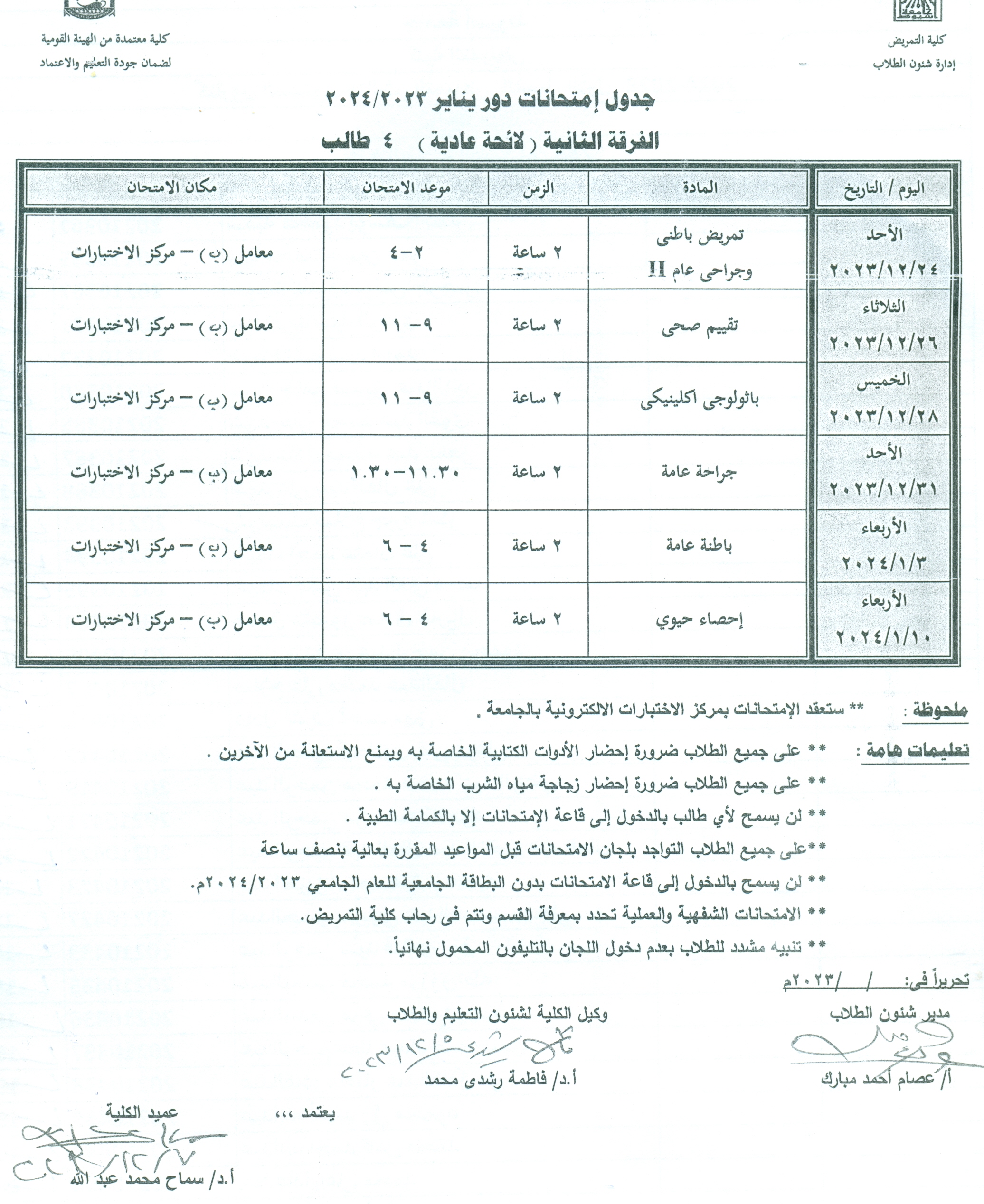 جدول امتحانات دور يناير 2023/2024 الفرقة الثانية (لائحة عادية ) 4 طالب