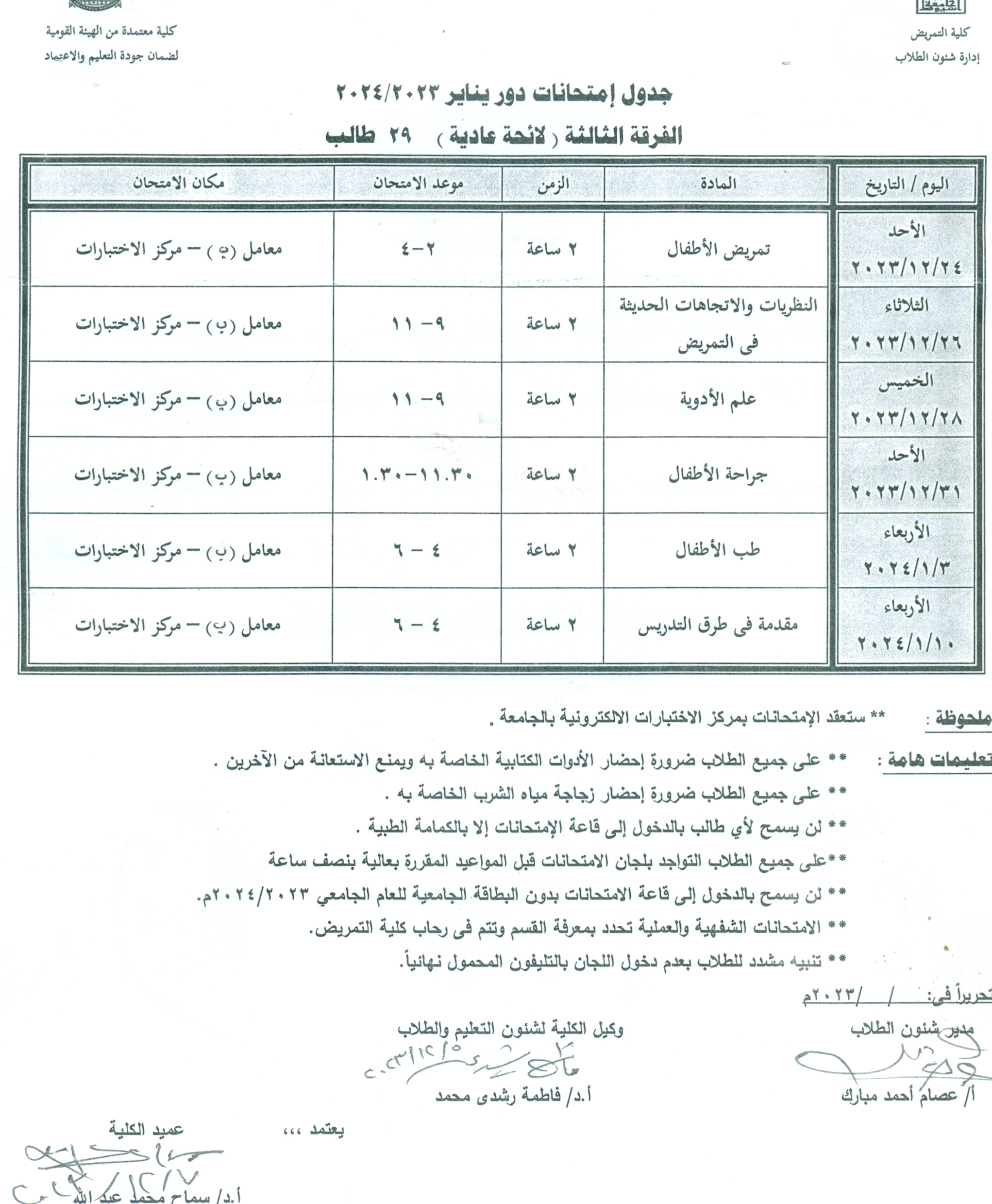 جدول امتحانات دور يناير 2023/2024 الفرقة الثالثة (لائحة عادية ) 29 طالب