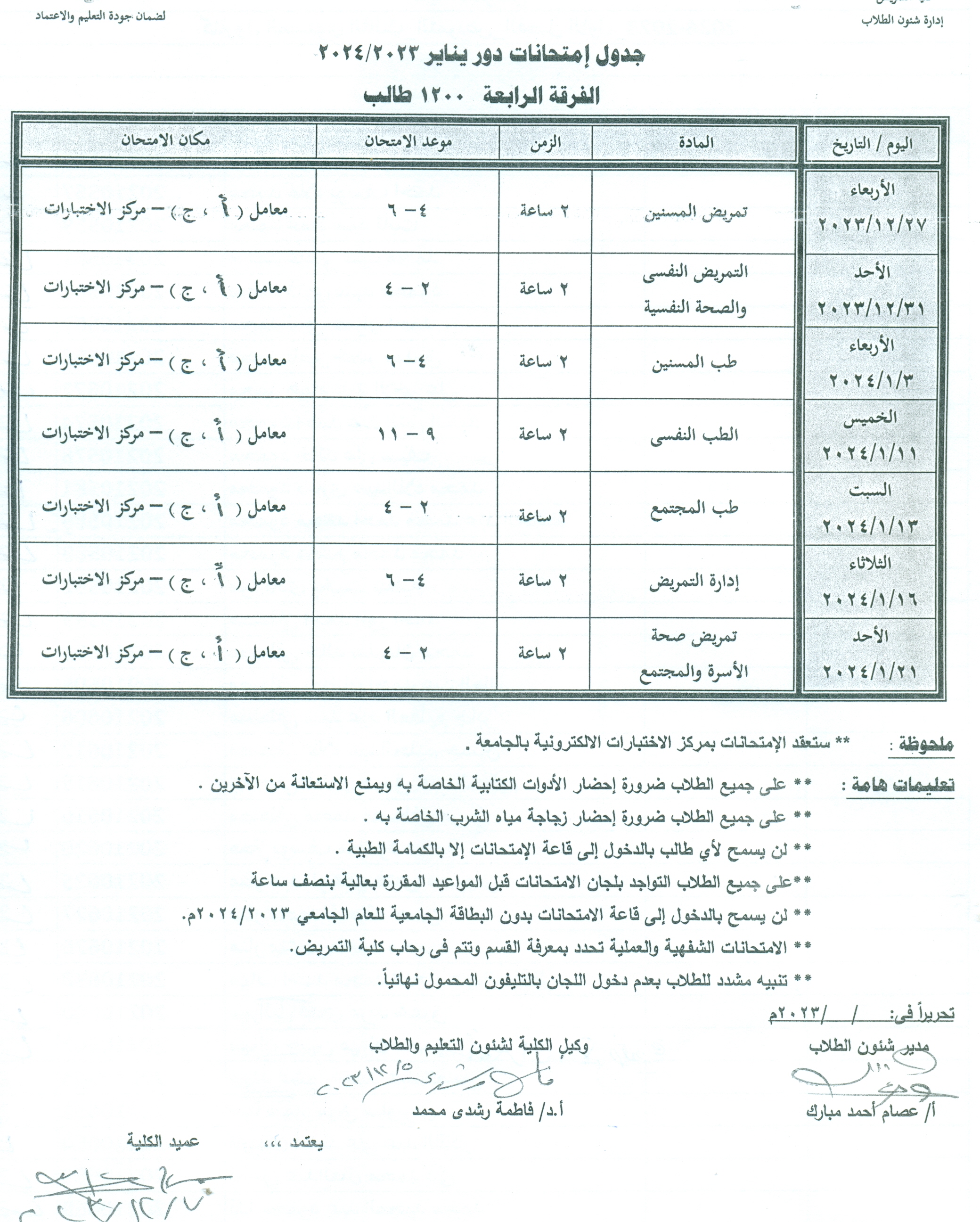 جدول امتحانات دور يناير 2023/2024 الفرقة الرابعة 1200 طالب