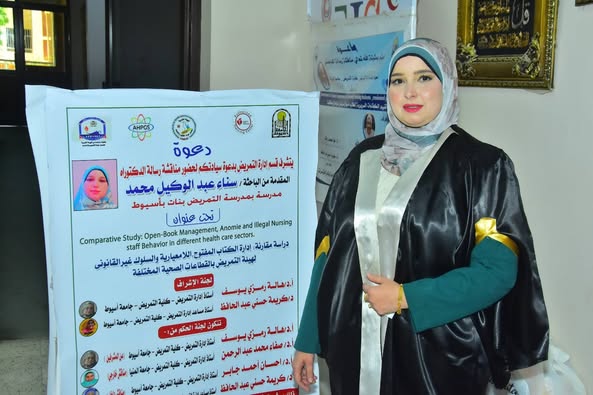 قبول رسالة الدكتوراه الخاصة الباحثة/ سناء عبد الوكيل محمد مدرسة بمدرسة التمريض بنات أسيوط