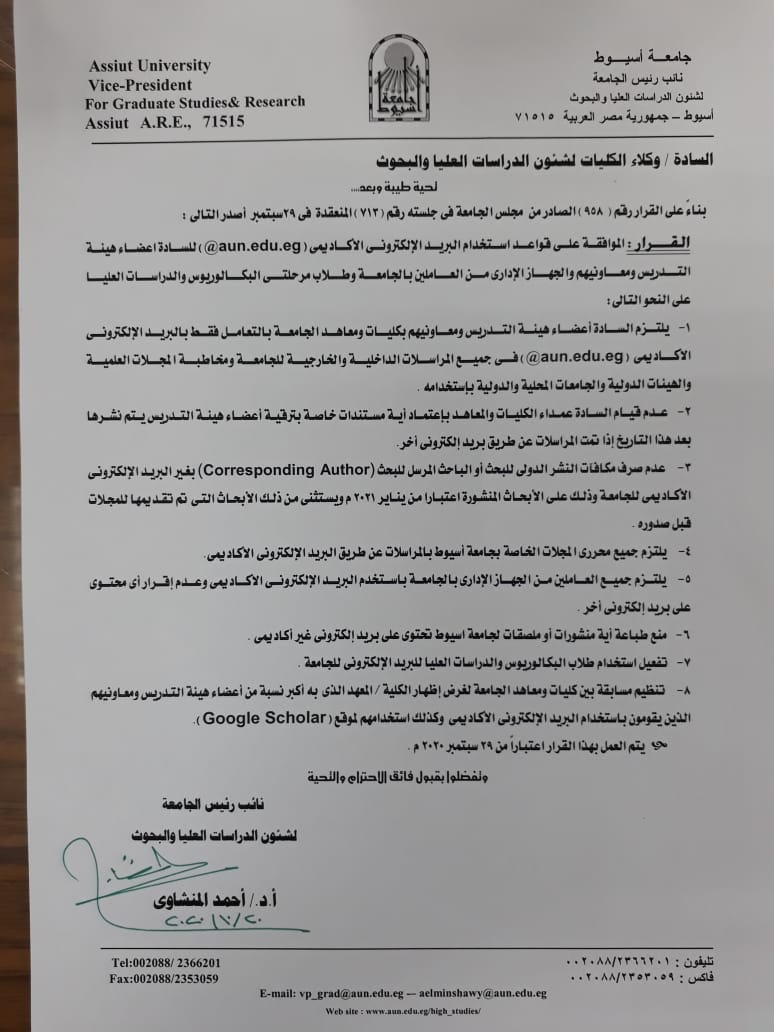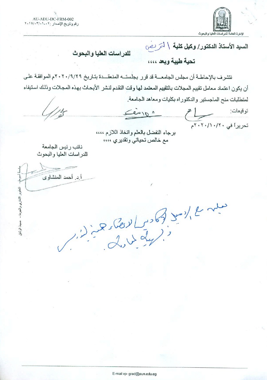 قرار مجلس الجامعة الخاص بالموافقة على اعتماد معامل تقييم المجلات بالتقييم المعتمد لها وقت التقدم لنشر الأبحاث بهذه المجلات وذلك لاستيفاء متطلبات منح الماجستير والدكتوراه