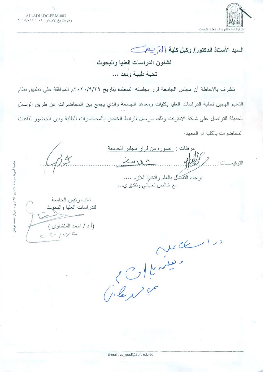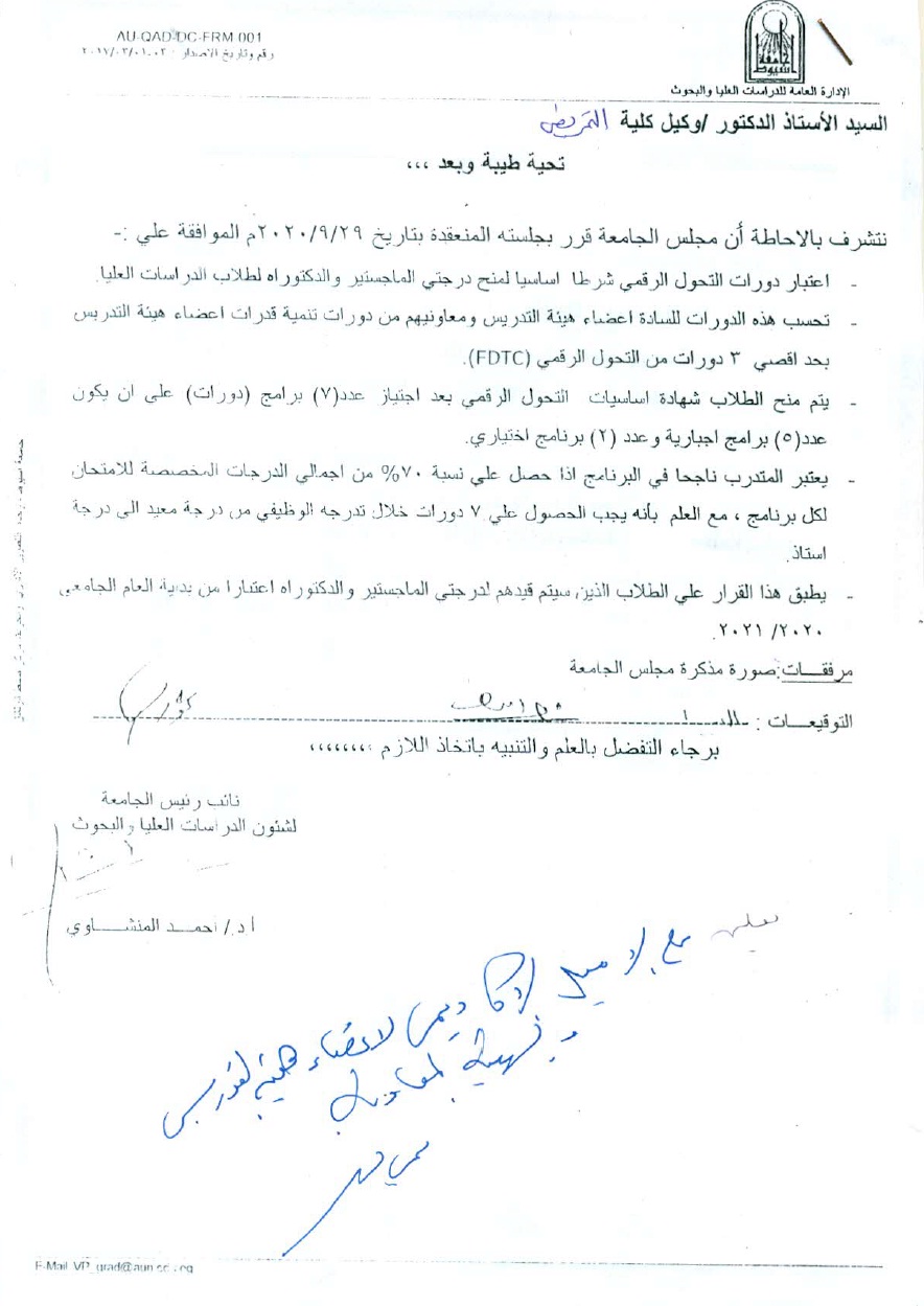 قرار مجلس الجامعة الخاص بالموافقة على تطبيق نظام التعليم الهجين لطلبة الدراسات العليا بكليات ومعاهد الجامعة