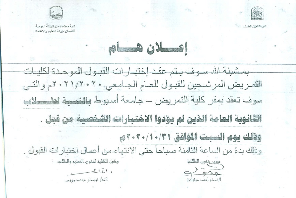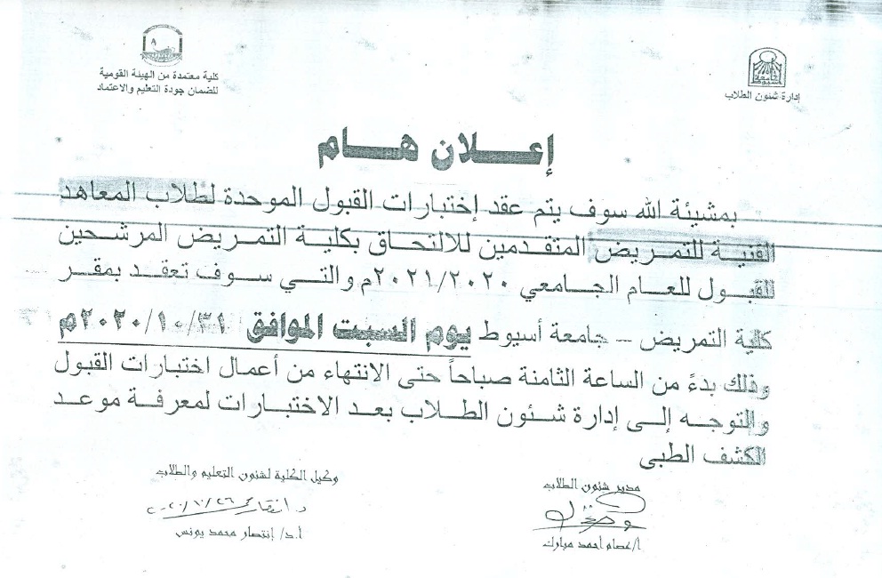 موعد اختبارات القبول الموحدة لطلاب المعاهد الفنية للتمريض المتقدمين للالتحاق بكلية التمريض المرشحين للقبول للعام الجامعي 2020-2021
