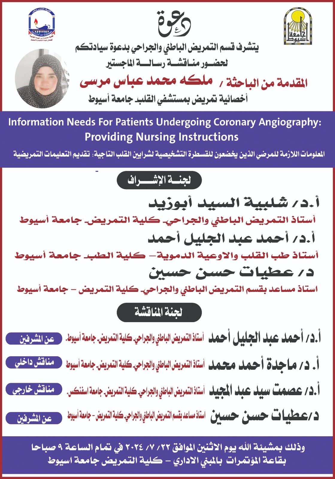 وذلك يوم الأحد الموافق 20-7-2024م في تمام الساعة 11 صباحا بقاعةالمناقشات بالمني الإداري  بكلية التمريض - جامعة اسيوط