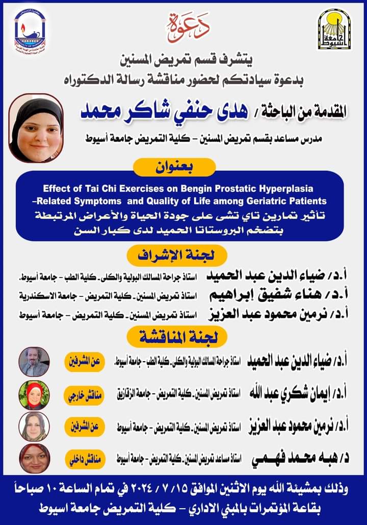 قبول رسالة الدكتوراه الخاصة بالباحثة/ هدي حنفي شاكر محمد مدرس مساعد بقسم تمريض المسنين كلية التمريض - جامعة ‏أسيوط.‏
