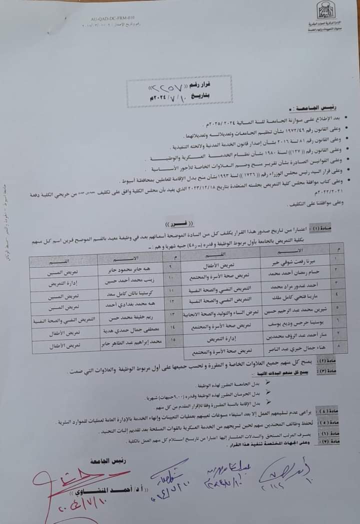 تكليف ١٦ معيد من دفعة ٢٠٢٢ بالاقسام المختلفة بكلية التمريض طبقا للخطة الخمسية للجامعة
