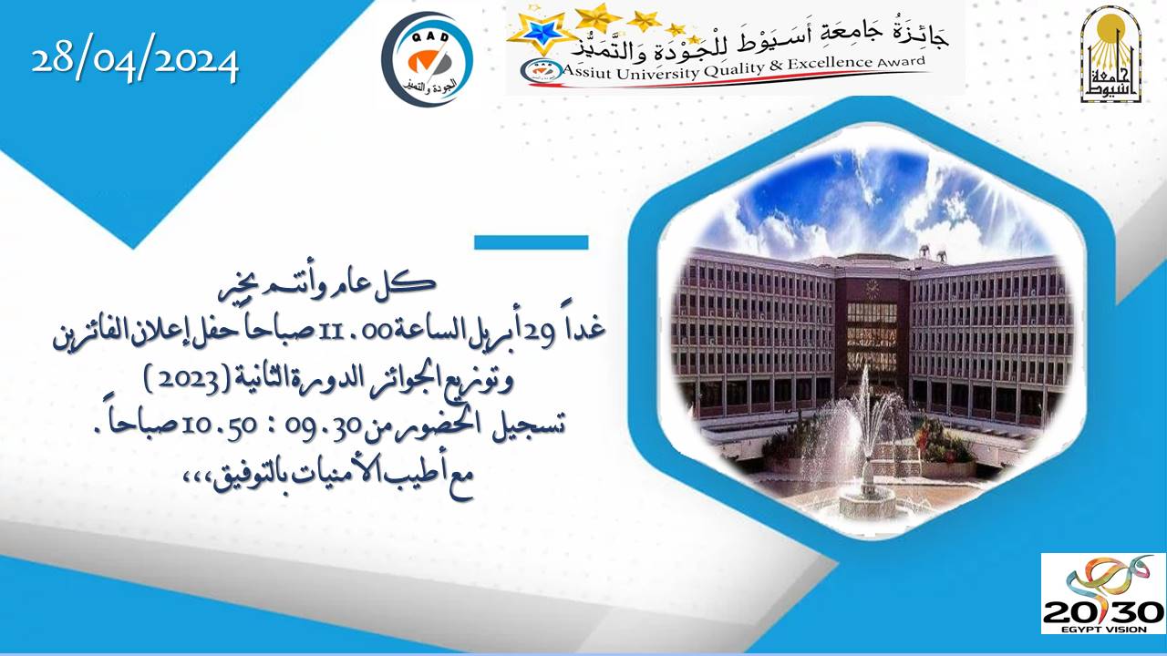 كلية التمريض جامعة اسيوط تحصد المركز الثانى فى جائزة جامعة أسيوط للجودة والتميز فى مسابقة جائزة الكلية المتميزة والمركز الرابع فى مسابقة افضل موقع إلكتروني على مستوى الجامعة