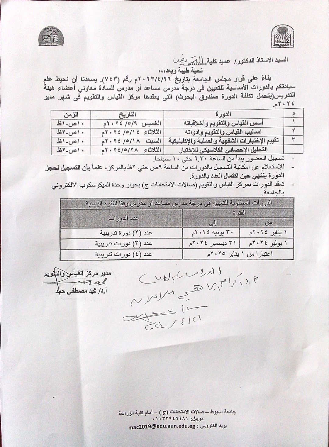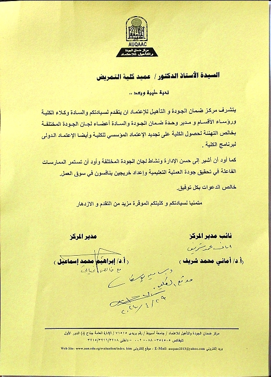 تهنئة من مركز ضمان الجودة والتأهيل للأعتماد لحصول الكلية علي تجديد الإعتماد المؤسسي للكلية وأيضا الإعتماد الدولي لبرنامج الكلية