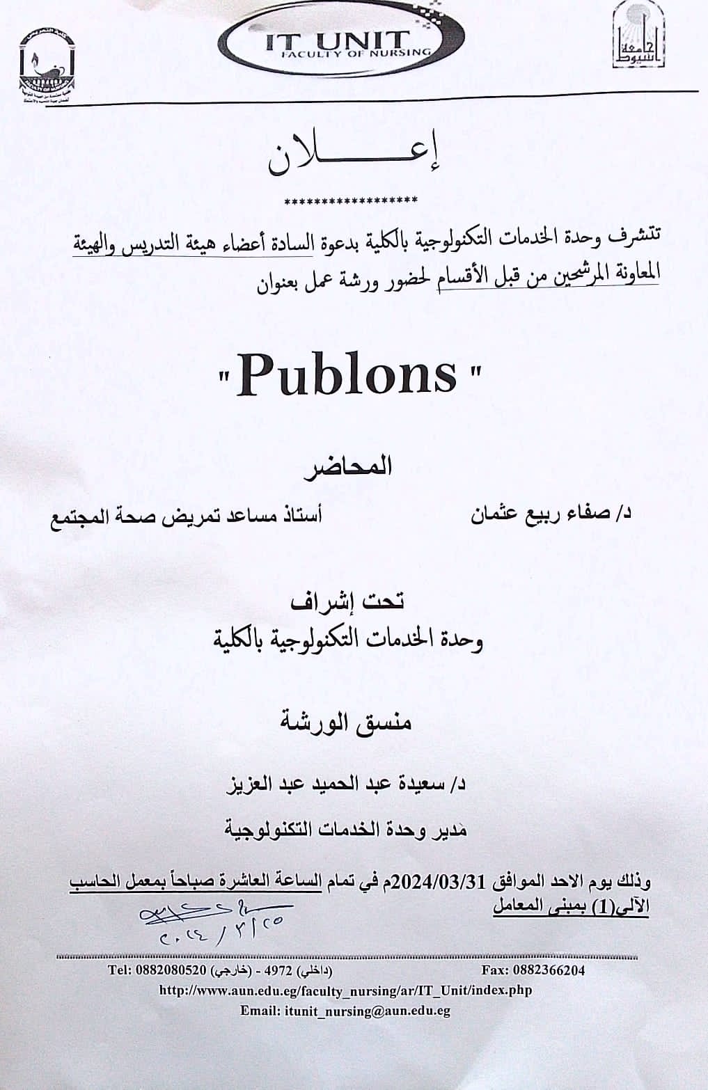 وذلك يوم الأحد الموافق 17-3-2024م مكتب السيدة الأستاذ الدكتور/ وكيل الكلية لشئون خدمة المجتمع وتنمية البيئة بكلية التمريض جامعة أسيوط في تمام الساعة العاشرة صباحا