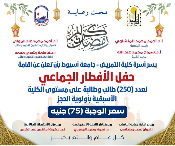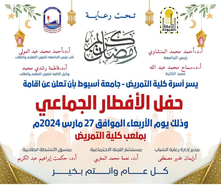 تحت رعاية السيد الاستاذ الدكتور سماح محمد عبدالله عميد الكلية والسيد الاستاذ الدكتور فاطمة رشدى محمد وكيل الكلية لشئون التعليم والطلاب وإشراف السيد الاستاذ الدكتور نعمة محمد المغربى رئيس قسم تمريض صحة المجتمع ومتابعة وحضور السادة أعضاء هيئه التدريس بالقسم