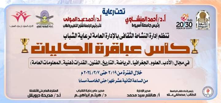 تتقدم السيد الاستاذ الدكتور سماح محمد عبدالله عميد الكلية والسادة الوكلاء وإدارة رعاية الشباب بالتهانى القلبية لفريق العباقرة بالكلية للتصفيات لدور الثمانية وفوزهم على فريق عباقرة كلية الفنون الجميلة بفارق نقاط ١٧٠ لصالح فريق عباقرة التمريض مقابل ٦٠نقطة
