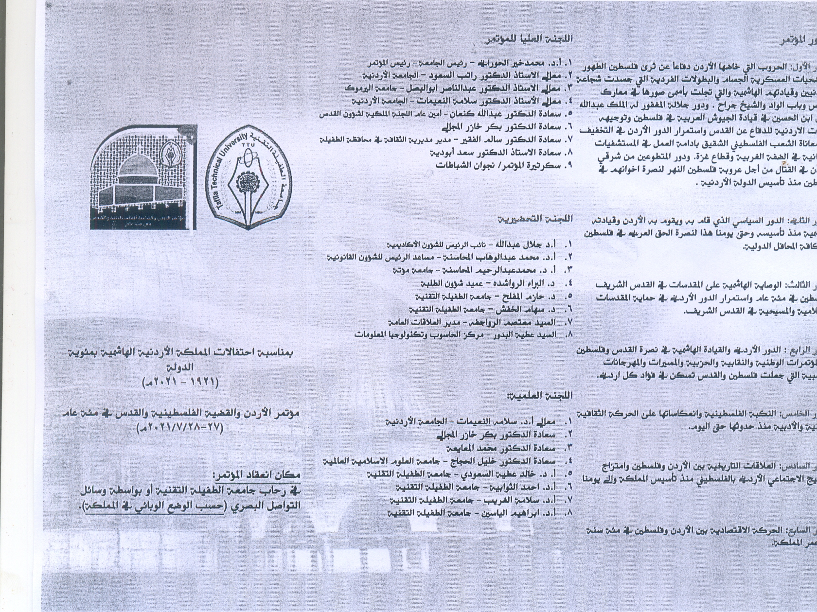 2021-07-27 أربعاء, 28 يوليوز 2021 - 12:00 عقد مؤتمر "الأردن والقضية الفلسطنية والقدس في مئة عام" عقد مؤتمر "الأردن والقضية الفلسطنية والقدس في مئة عام"