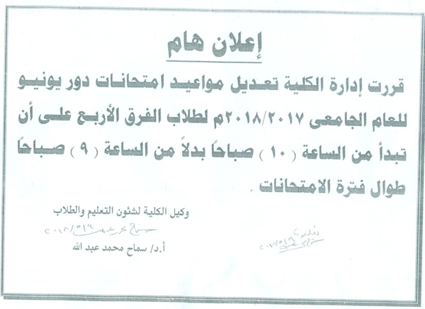 تعديل مواعيد امتحانات دور يونيو للعام الجامعي 2017/2018م 15 مايو 2018 تعديل مواعيد امتحانات دور يونيو للعام الجامعي 2017/2018م