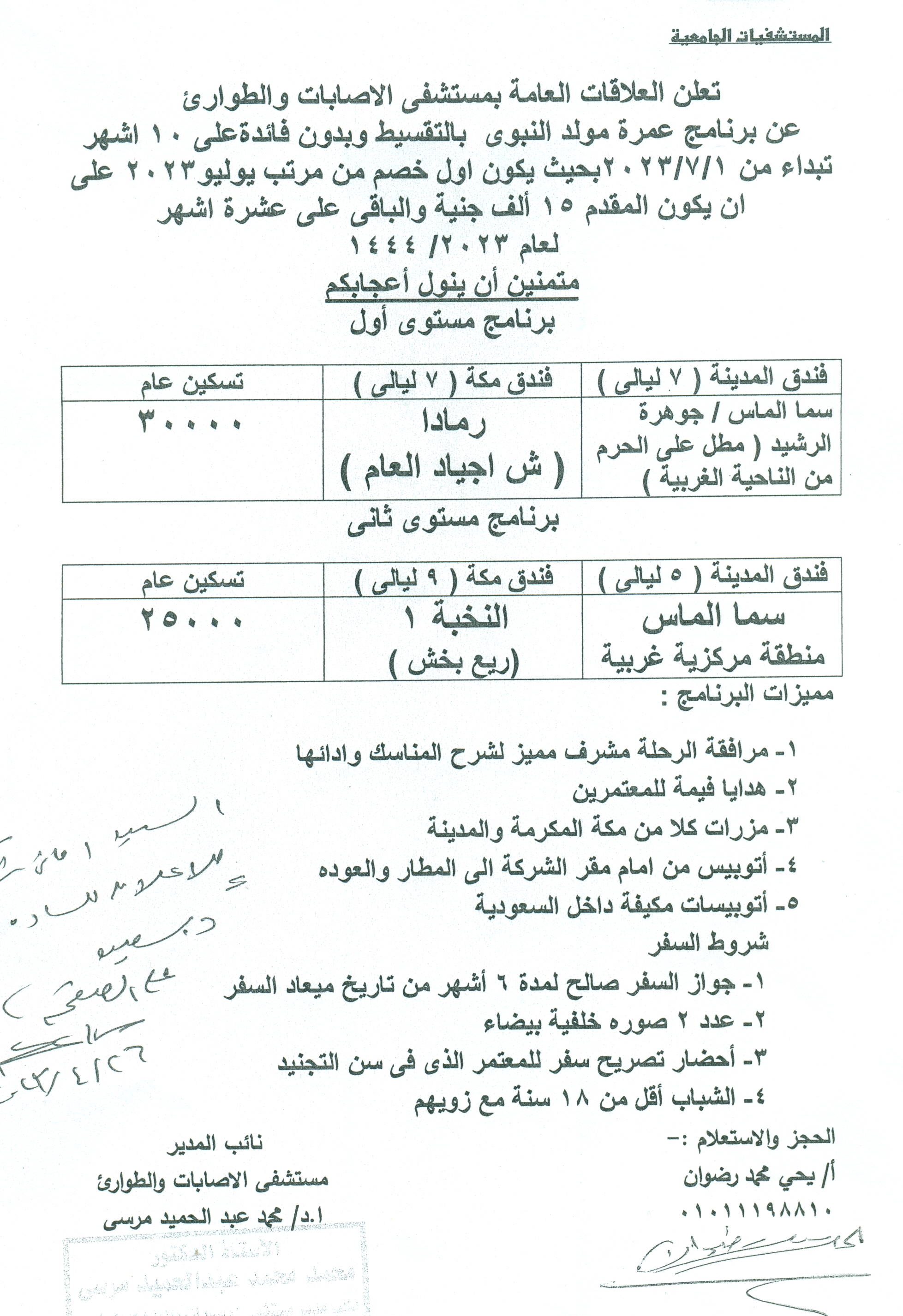 تعلن العلاقات العامة بمستشفي الاصابات والطؤارئ عن برنامج عمرة مولد النبوي بالتقسيط وبدون فائدة علي 10 اشهر تبدأ 1/7/2023 25 يونيو 2023