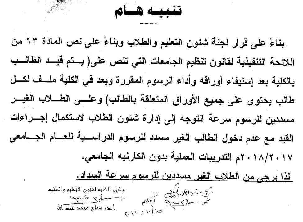 تنبيه هاااااااااااام للطلاب الغير مسددين للرسوم 23 أكتوبر 2017 تنبيه هاااااااااااام للطلاب الغير مسددين للرسوم