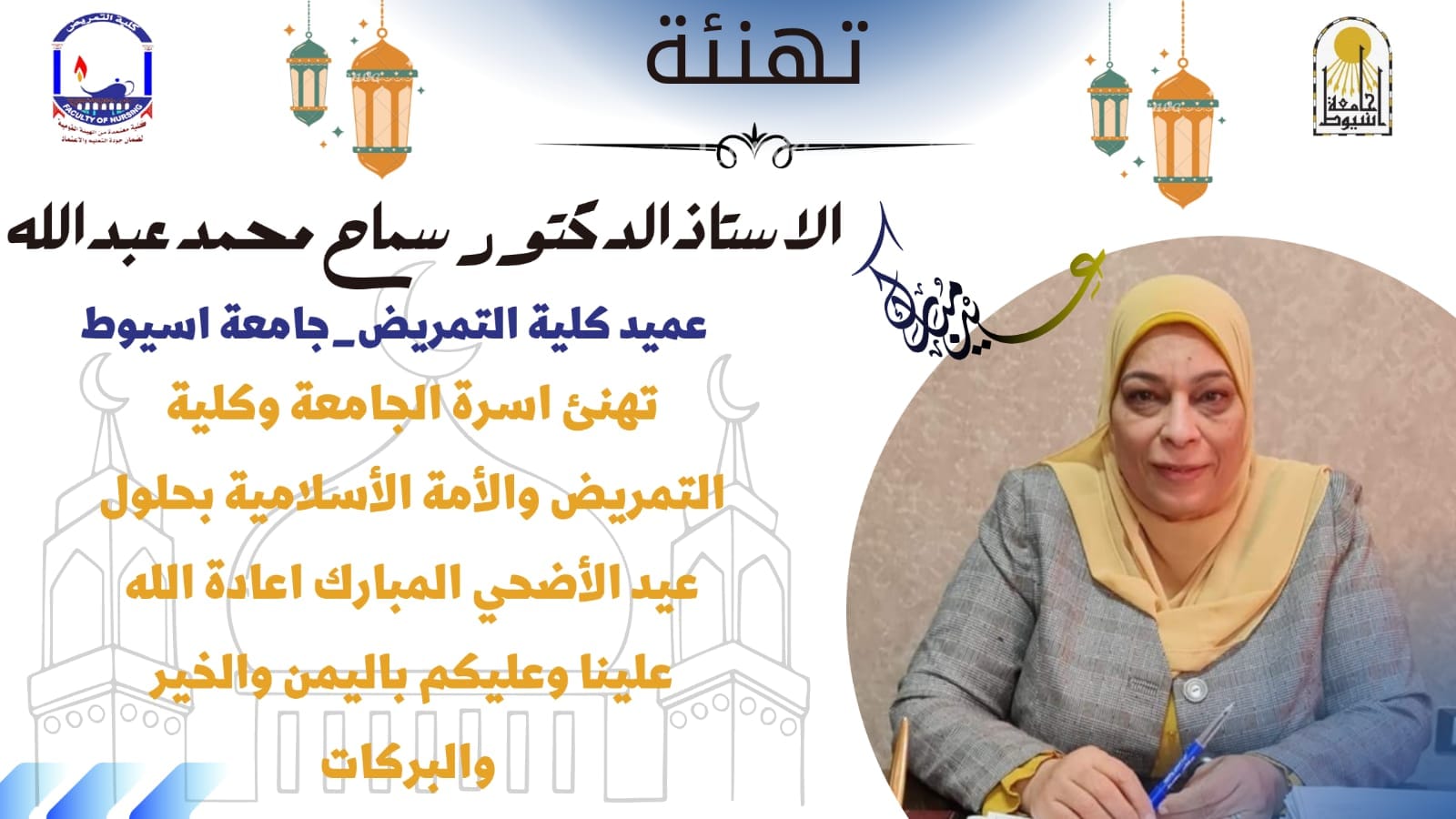 تتقدم السيد الأستاذ الدكتور/ سماح محمد عبدالله عميد الكلية بأجمل التهاني القلبية لأسرة جامعة أسيوط وأسرة كلية التمريض والأمة الإسلامية بمناسبة عيد الأضحى المبارك اعاده الله علينا وعليكم بالخير واليمن والبركات