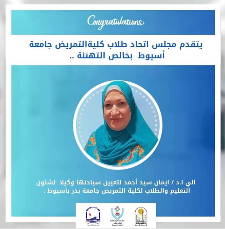 تتقدم السيد الاستاذ الدكتور سماح محمد عبدالله عميد الكلية والسادة الوكلاء والسادة رؤساء الأقسام والسادة اعضاء هيئة التدريس والعاملين والطلاب بالكلية باجمل التهانى القلبية للسيد الاستاذ الدكتور ايمان سيد احمد لتعينها وكيلا لكلية التمريض جامعة بدر