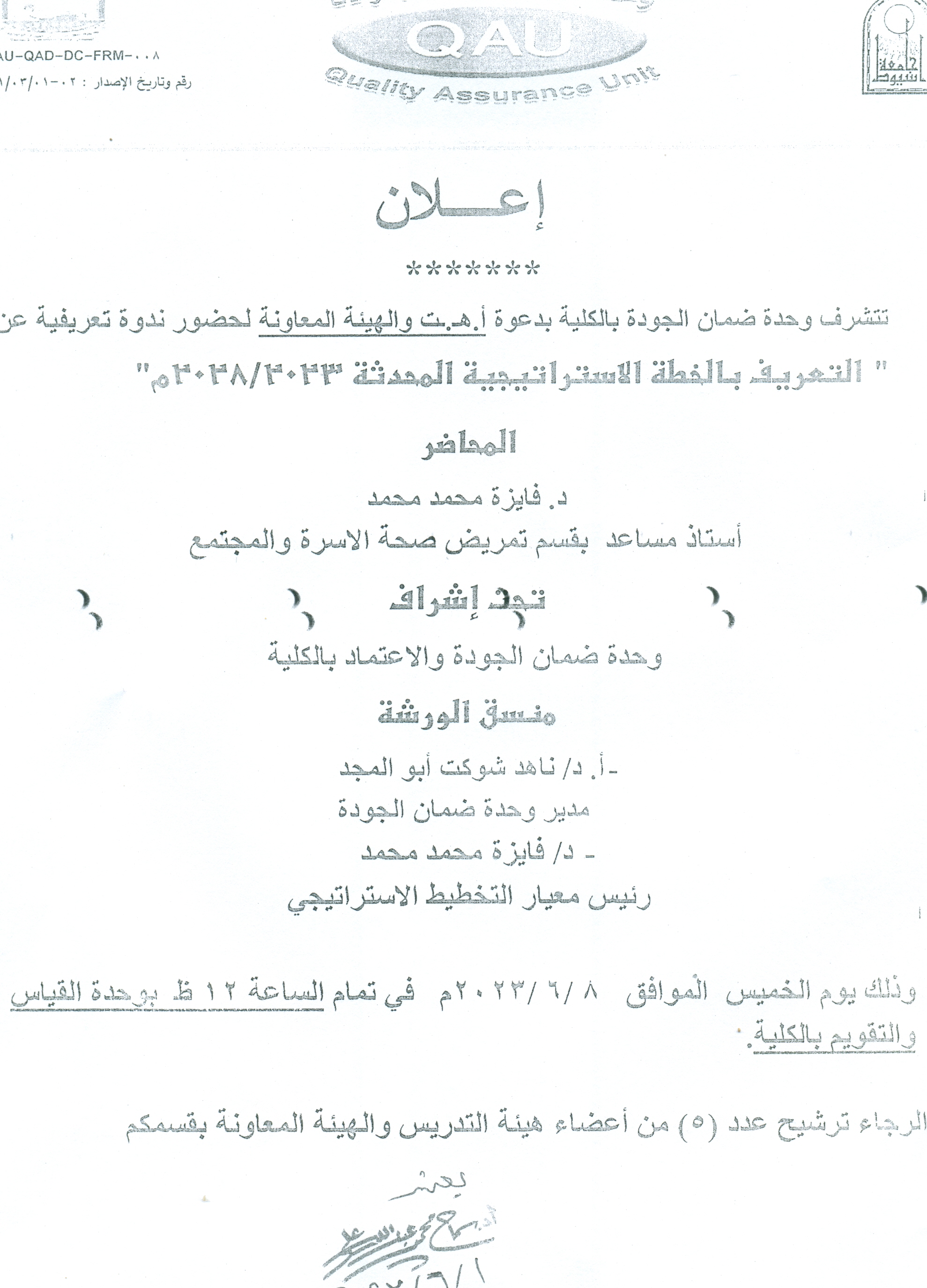تتشرف وحدة ضمان الجودة بالكلية بدعوة ا.ه.ت والهيئة المعاونة لحضور ندوة تعريفية عن "التعريف بالخطة الاستراتيجية المحدثة 2023/2028" 7 يونيو 2023