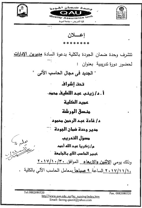 وحدة ضمان الجودة والاعتماد بالكلية تنظم ورشة عمل تحت عنوان " الجديد في مجال الحاسب الآلي " وتدعو مديرين الإدارات لحضور الندوة 26 أكتوبر 2017 وحدة ضمان الجودة والاعتماد بالكلية تنظم ورشة عمل تحت عنوان " الجديد في مجال الحاسب الآلي " وتدعو مديرين الإدارات لحضور الندوة