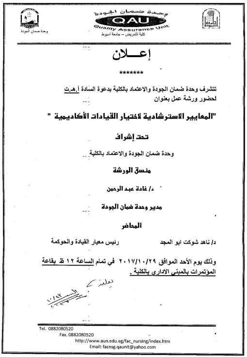 وحدة ضمان الجودة والاعتماد بالكلية تنظم ورشة عمل تحت عنوان " المعايير الاسترشادية لاختيار القيادات الأكاديمية " 26 أكتوبر 2017 وحدة ضمان الجودة والاعتماد بالكلية تنظم ورشة عمل تحت عنوان " المعايير الاسترشادية لاختيار القيادات الأكاديمية "