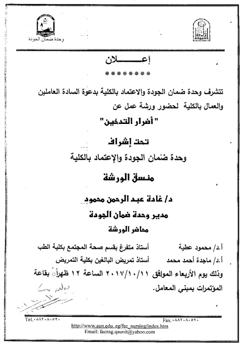 ورشة عمل بعنوان "أضرار التدخين" للسادة العاملين بالكلية 11 أكتوبر 2017 ورشة عمل بعنوان "أضرار التدخين" للسادة العاملين بالكلية