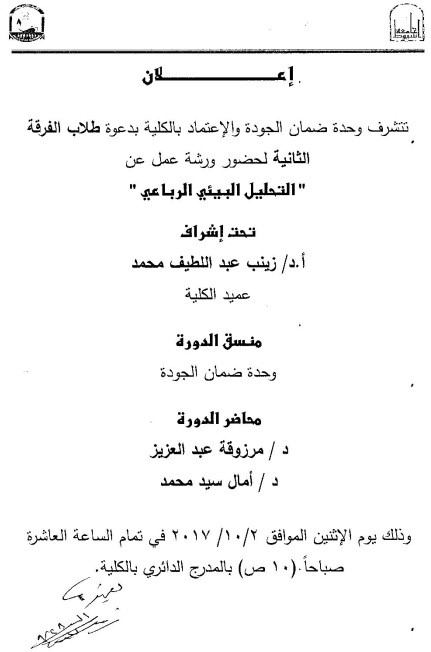 ورشة عمل بعنوان "التحليل البيئي الرباعي" لطلاب الفرقة الثانية 2 أكتوبر 2017 ورشة عمل بعنوان "التحليل البيئي الرباعي" لطلاب الفرقة الثانية