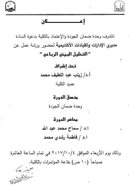 ورشة عمل بعنوان "التحليل البيئي الرباعي" مديري الإدارات والقيادات الأكاديمية 4 أكتوبر 2017 ورشة عمل بعنوان "التحليل البيئي الرباعي" مديري الإدارات والقيادات الأكاديمية