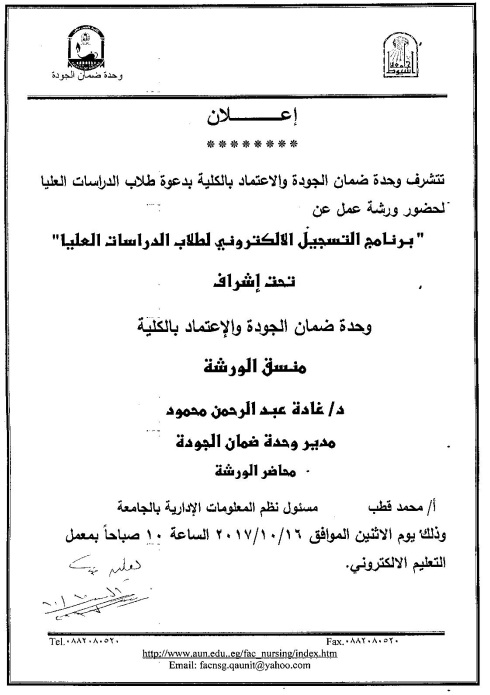 ورشة عمل بعنوان "برنامج التسجيل الإلكتروني لطلاب الدراسات العليا" لطلاب الدراسات العليا 11 أكتوبر 2017 ورشة عمل بعنوان "برنامج التسجيل الإلكتروني لطلاب الدراسات العليا" لطلاب الدراسات العليا