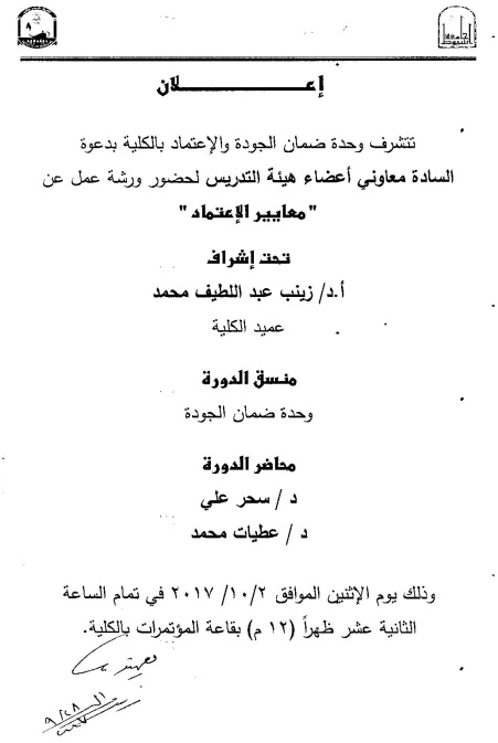 ورشة عمل بعنوان "معايير الاعتماد" للسادة معاوني أعضاء هيئة التدريس