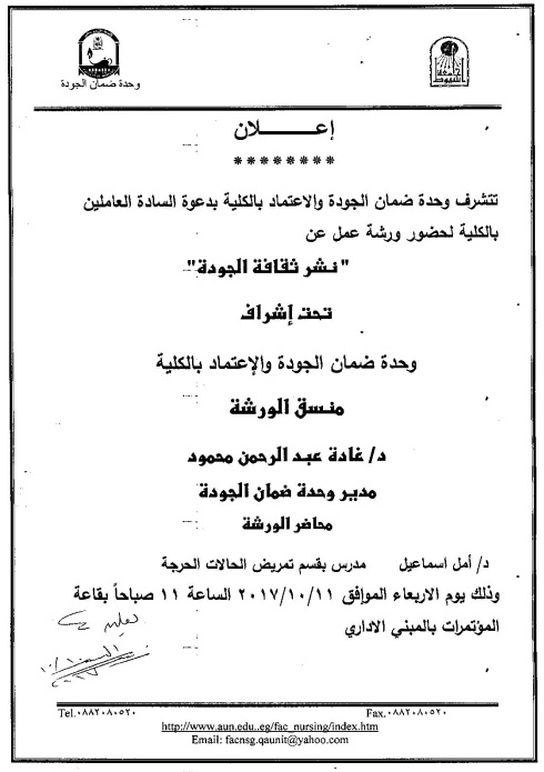 ورشة عمل بعنوان "نشر ثقافة الجودة" للسادة العاملين بالكلية 11 أكتوبر 2017 ورشة عمل بعنوان "نشر ثقافة الجودة" للسادة العاملين بالكلية