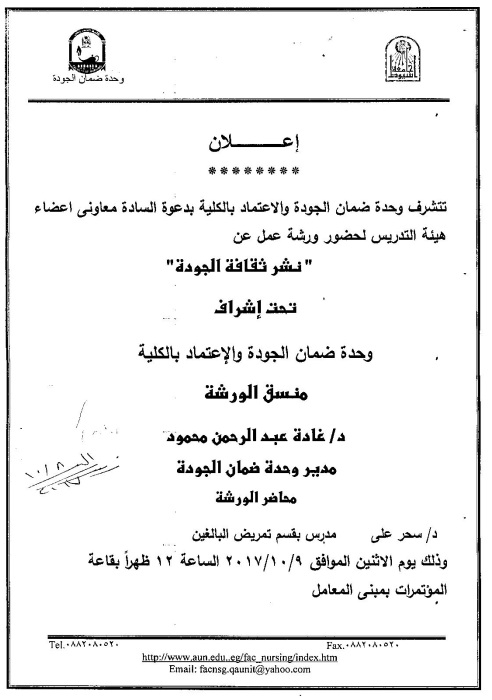 ورشة عمل بعنوان "نشر ثقافة الجودة" لمعاونى أعضاء هيئة التدريس 9 أكتوبر 2017 ورشة عمل بعنوان "نشر ثقافة الجودة" لمعاونى أعضاء هيئة التدريس
