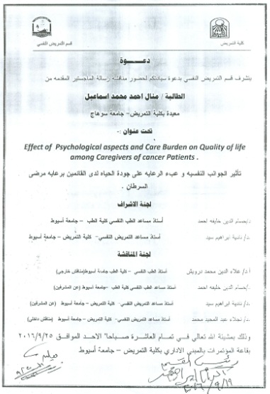 By God willing, master thesis submitted by researcher/ Manal Ahmed Mohamed Ismail - demonstrator, Faculty of Nursing, Sohag University- will be discussed on Sunday, 25/9/2016, at 10:00 a.m., at the conference hall of the college.