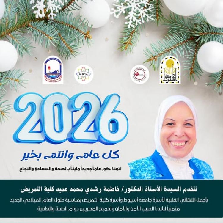 - Professor Dr. Fatima Rushdi Mohamed, Dean of the Faculty, extends her heartfelt congratulations to the Assiut University family and the Faculty of Nursing family on the occasion of the New Year, wishing our beloved country security and safety