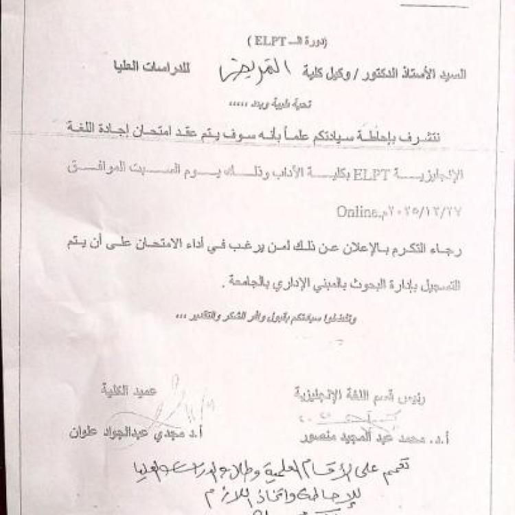- The ELPT English language exam will be held at the Faculty of Arts on Saturday, 12-27-2025