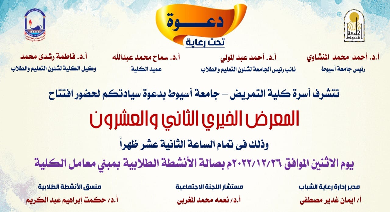 An invitation to all our students to attend the opening of the twenty-second charity exhibition on Monday, 12/26/2022 at twelve o'clock in the student activities hall in the laboratory building in the faculty