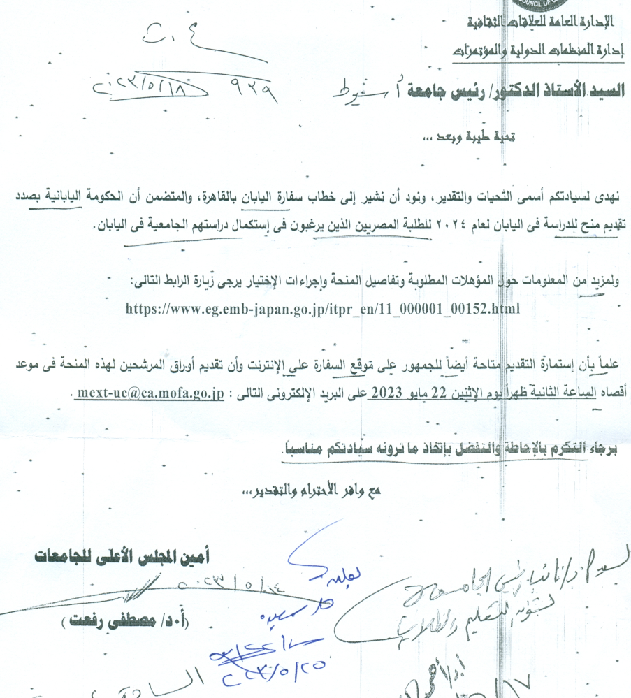 A letter from the Japanese Embassy in Cairo, which states that the Japanese government is about to offer a scholarship to study in Japan for the year 2024 AD for Egyptian students who wish to complete their university studies in Japan