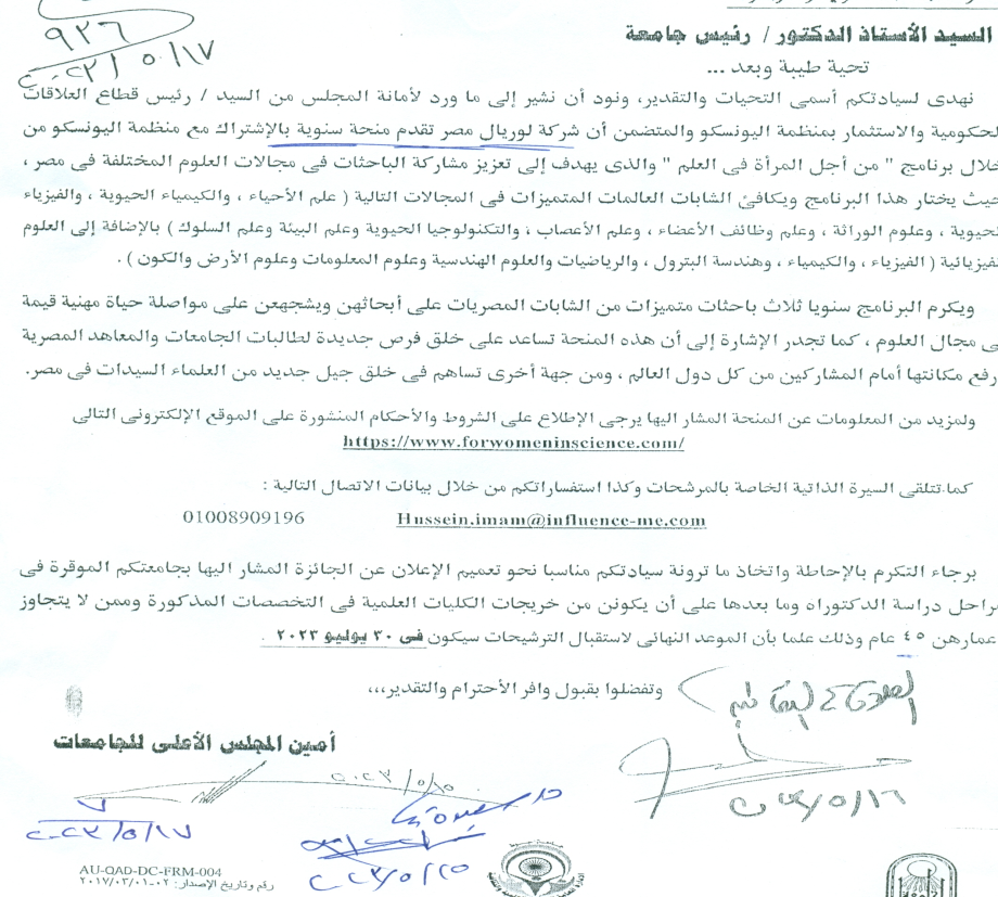 L'Oréal Egypt provides an annual grant in partnership with UNESCO through the program "For Women in Science" 25 May 2023